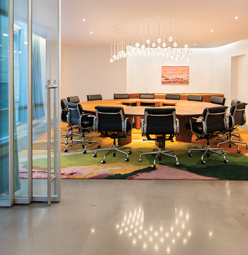 In one conference room, six LittleOnes Zepto 1” downlights integrated into felt ACT tiles to provide balanced illumination—three on each side of a central pendant—perfect for both all-team meetings and screen presentations. In another, Zepto 1” downlights are installed along the perimeter to complement decorative pendants. These downlights deliver bright but comfortable 360° illumination of the circular conference table and surrounding space with advanced glare control, while the LittleOnes Micro 1.25” adjustable fixture draws attention to the artwork on the wall.